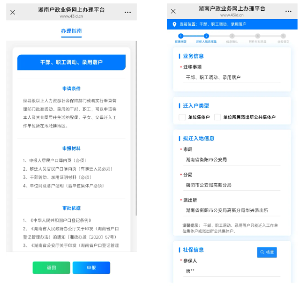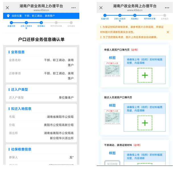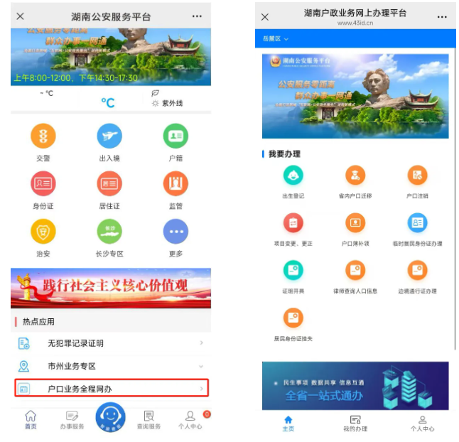 一、湖南户籍居民微信关注“湖南公安服务平台”公众号,注册并实人认证登录,点击“微警务”,进入平台首页,在热点应用栏中选择“户口业务全程网办”,或登录省政府“湘易办”APP首页,点击“户口业务全程网办”,点击进入湖南户政业务网上办理平台,在“我要办理”菜单中选择要申办的业务类型,阅读网办须知,填写相关信息,拍照上传证明材料,提交办件申请。