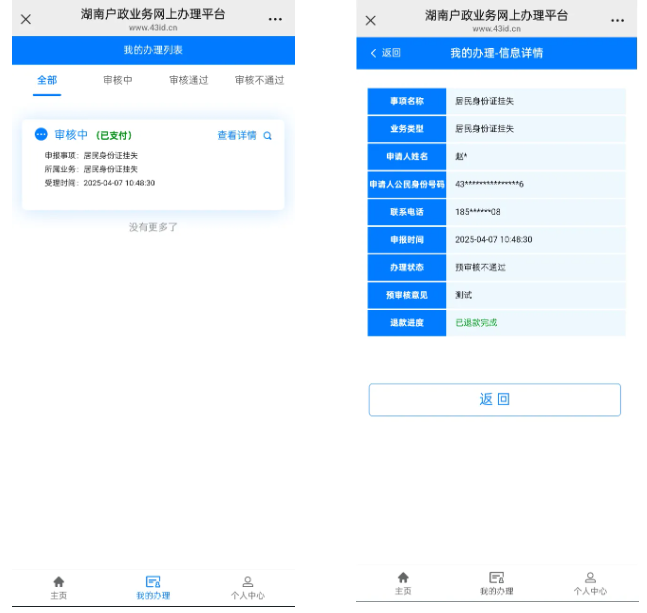 三、短信通知。申请人也可在平台首页“我的办理”中查询详情。