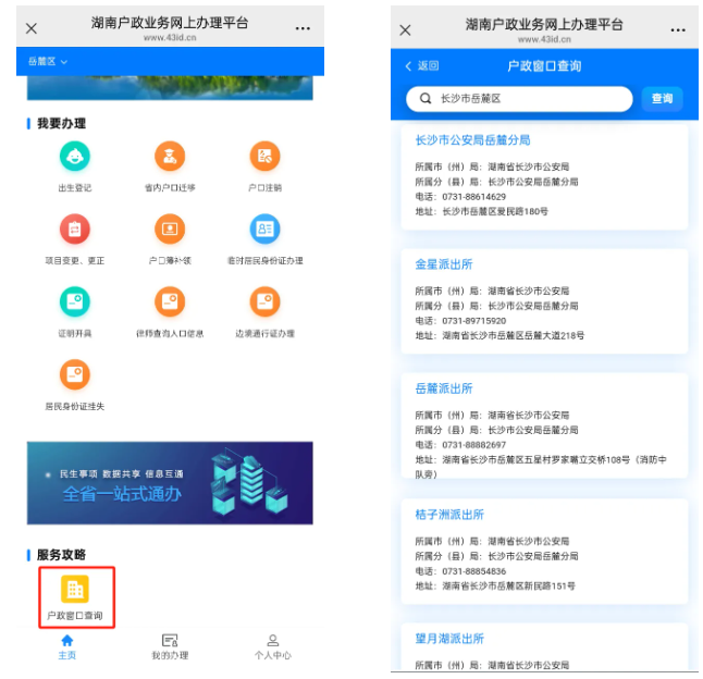 四、申请人在户口业务办理过程中,如需咨询相关业务,可在工作日(9:00—12:00,13:00—17:00)致电 0731-96305,或在湖南户政业务网上办理平台下方服务攻略中点击“户政窗口查询”,查找户籍地派出所电话进行咨询。