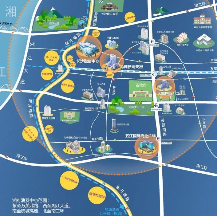 湘府消费中心依托五江城市商业广场、龙湖新姚天街、天城国际广场、九峰整村商业中心等项目的建设和招商,鼓励引进品牌首店、旗舰店等商业业态,进一步提升湘府消费中心生活服务品质。