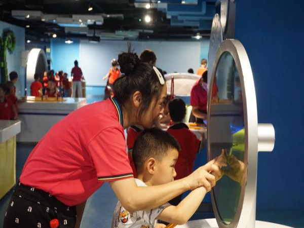 “数理启迪”“制造天地”“能源世界”“信息港湾”“地球家园”“生命体验”等多个展厅和板块呈现了大量的科普图片、文字、模型和实物,展区内的展品融合了科学性、趣味性与互动性,通过声、光、电、信息技术及其他高新技术手段的巧妙运用,激发着孩子们探索的热情,情境式的探索让孩子们驻足参观,流连忘返。