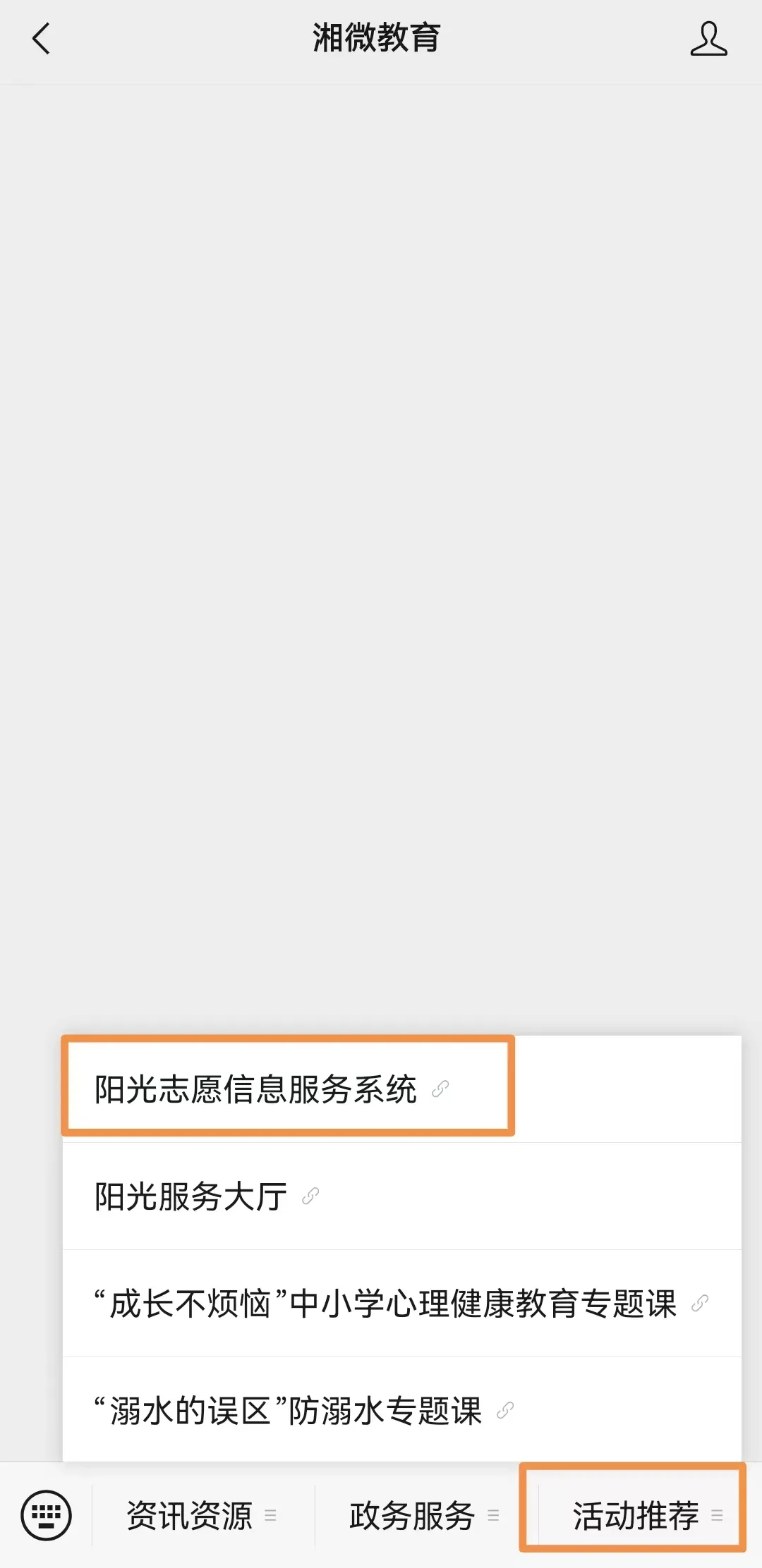 关注湖南省教育厅官方微信公众号:湘微教育(hnedugov),点击底部“活动推荐”—“阳光志愿信息服务系统”即可进入使用。