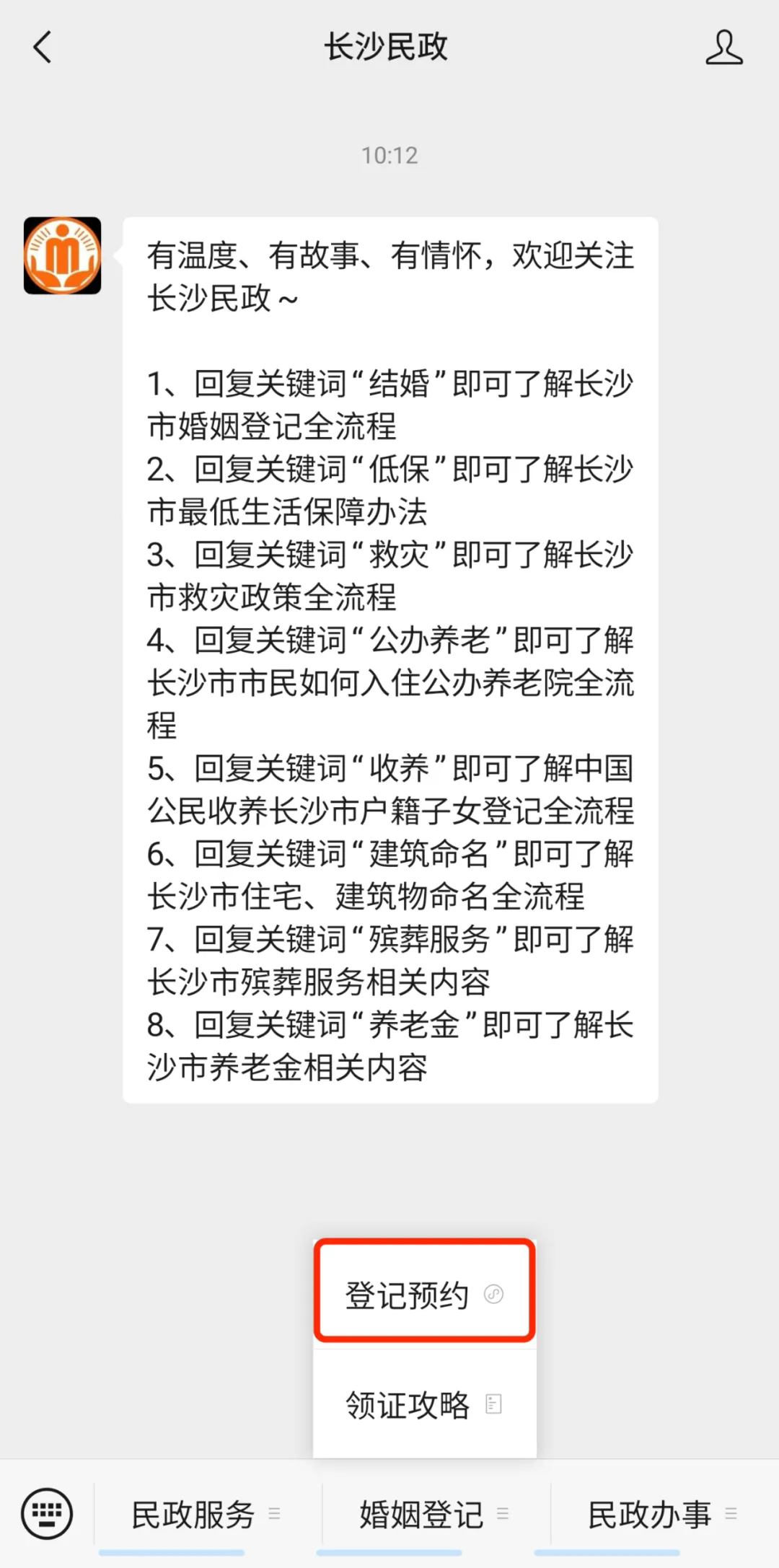 微信关注“长沙民政”公众号,首页点击“婚姻登记”,在“登记预约”栏进行预约初审。