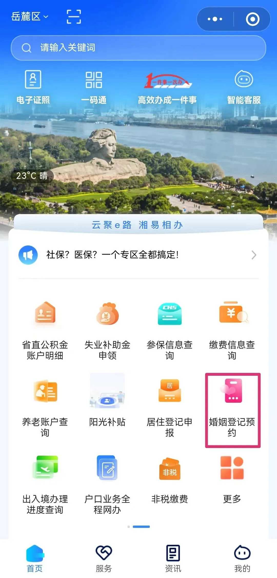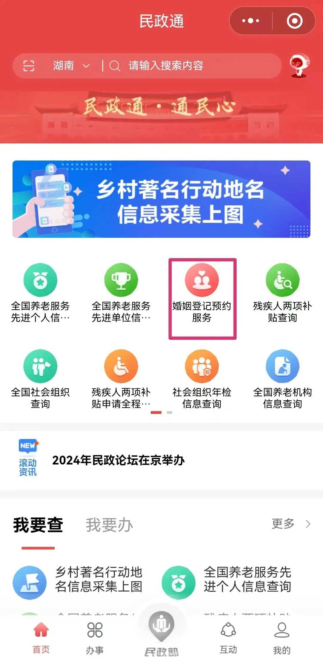 微信或支付宝搜索“民政通”小程序,进入首页“婚姻登记预约服务”,选择“湖南省”进行预约初审。