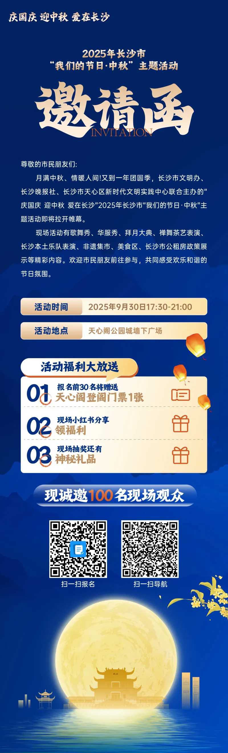 国庆、中秋来临之际,为大力弘扬爱国主义精神,深入挖掘中秋节的文化内涵,丰富市民精神文化生活,营造和谐、文明、欢乐的节日氛围,展现长沙宜居、宜业、宜游的良好形象,9月30日,将在天心阁公园城墙下广场举办2025年长沙市“我们的节日·中秋”主题活动。