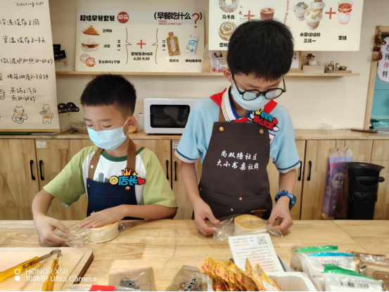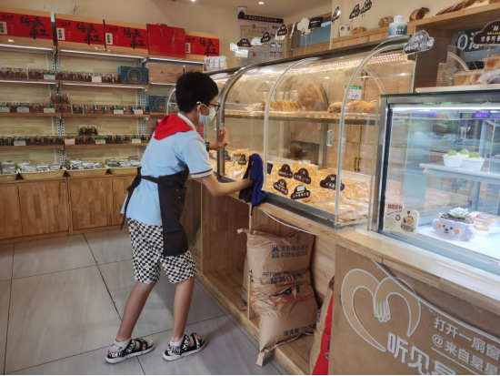 培训结束后,“小店长”们戴上专属围裙,迅速进入“工作模式”:有的踮起脚尖仔细擦拭面包展示柜;有的主动上前询问顾客需求;还有的在收银台前整理订单,仔细核对金额。面对偶尔的手忙脚乱,“小店长”们没有退缩,而是在店员的鼓励下,不再紧张,变得熟练又从容。